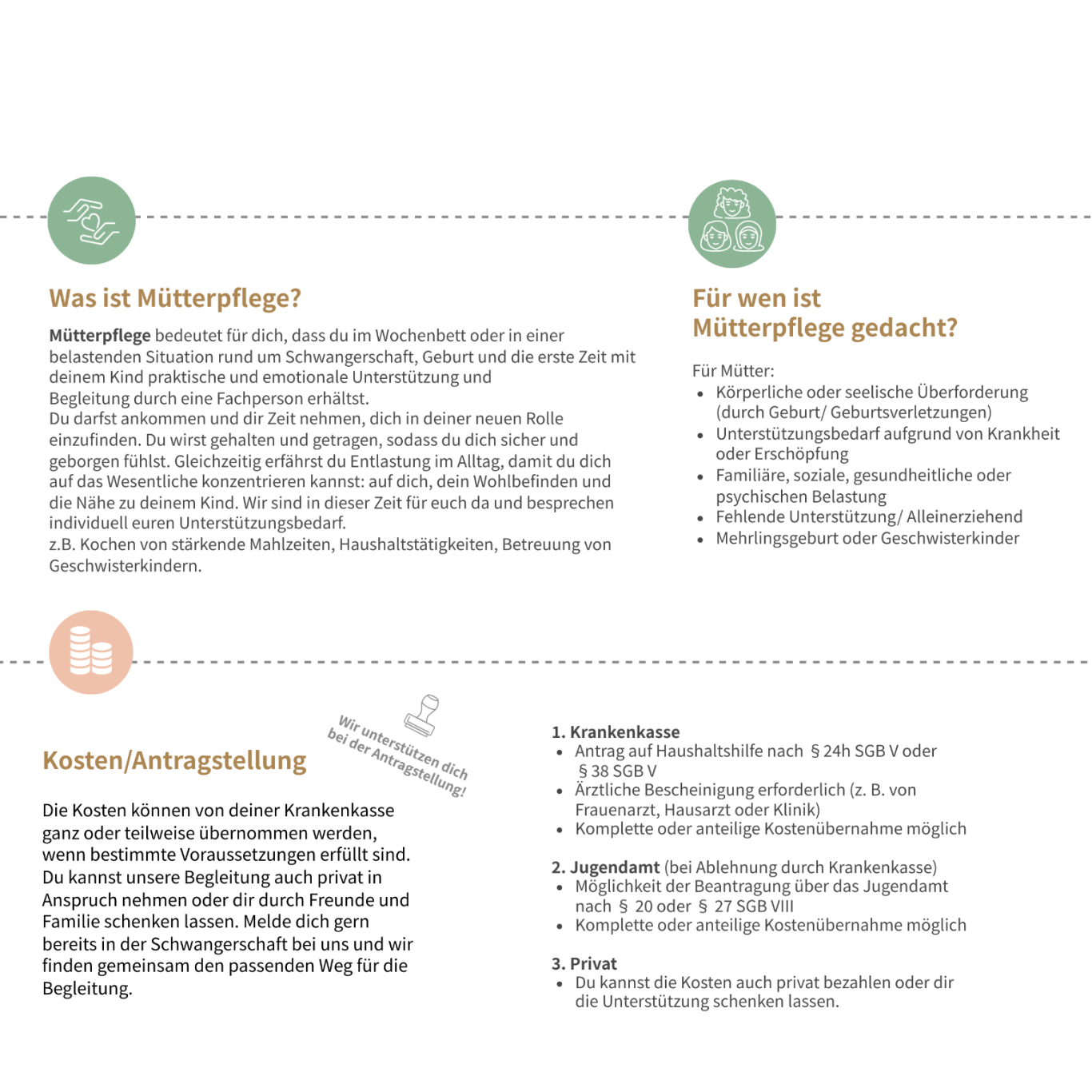 Manchmal braucht es einfach Unterstützung. Eine Mütterpflegerin kann Dir in dieser besonderen Zeit zur Seite stehen. Die Kosten können über die Krankenkasse, das Jugendamt oder privat übernommen werden.